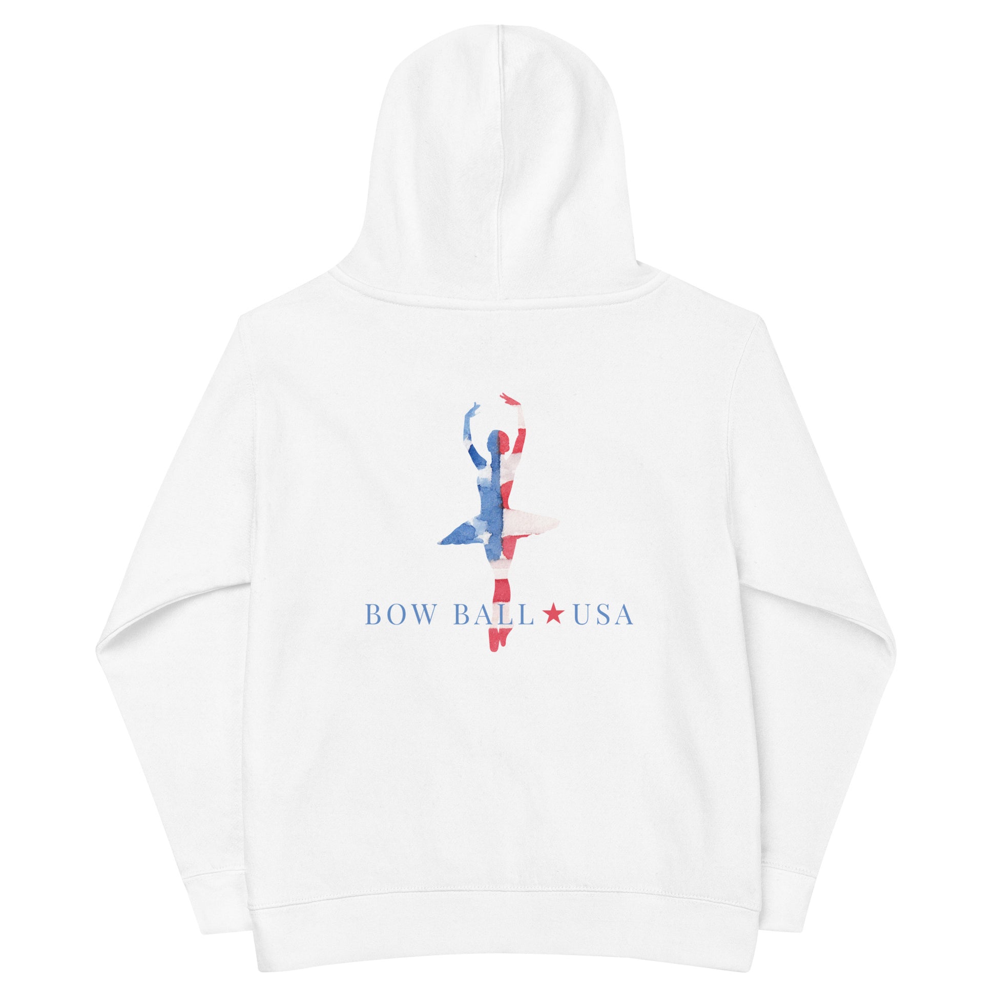 This soft and cozy fleece hoodie will become a go-to favorite for the children in your life. Made from durable material to ensure a long-lasting performance. Features All-American Ballet 🇺🇸 design on the back. May the children who wear this hoodie know they are loved. Bow Ball is cheering for them. #bowballit