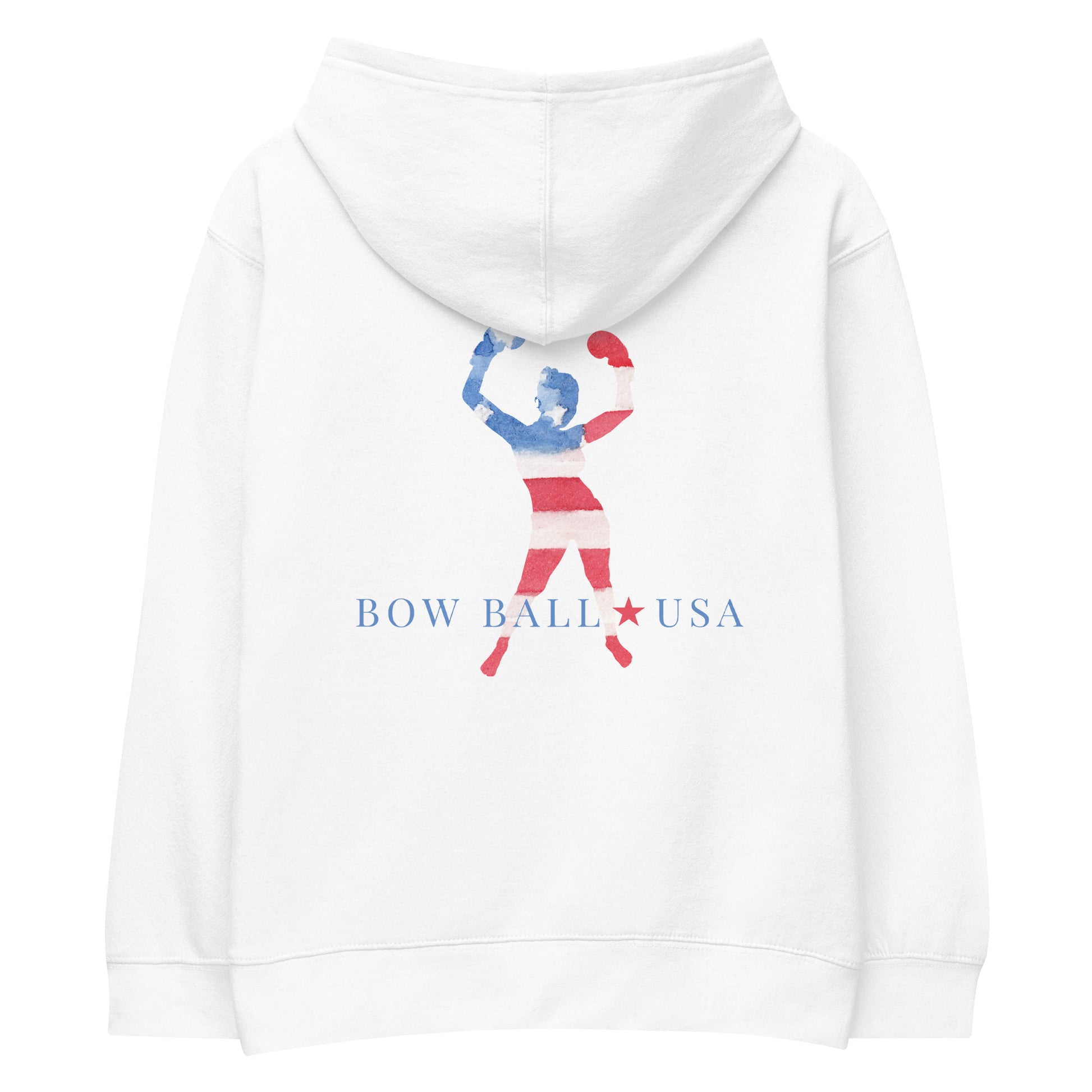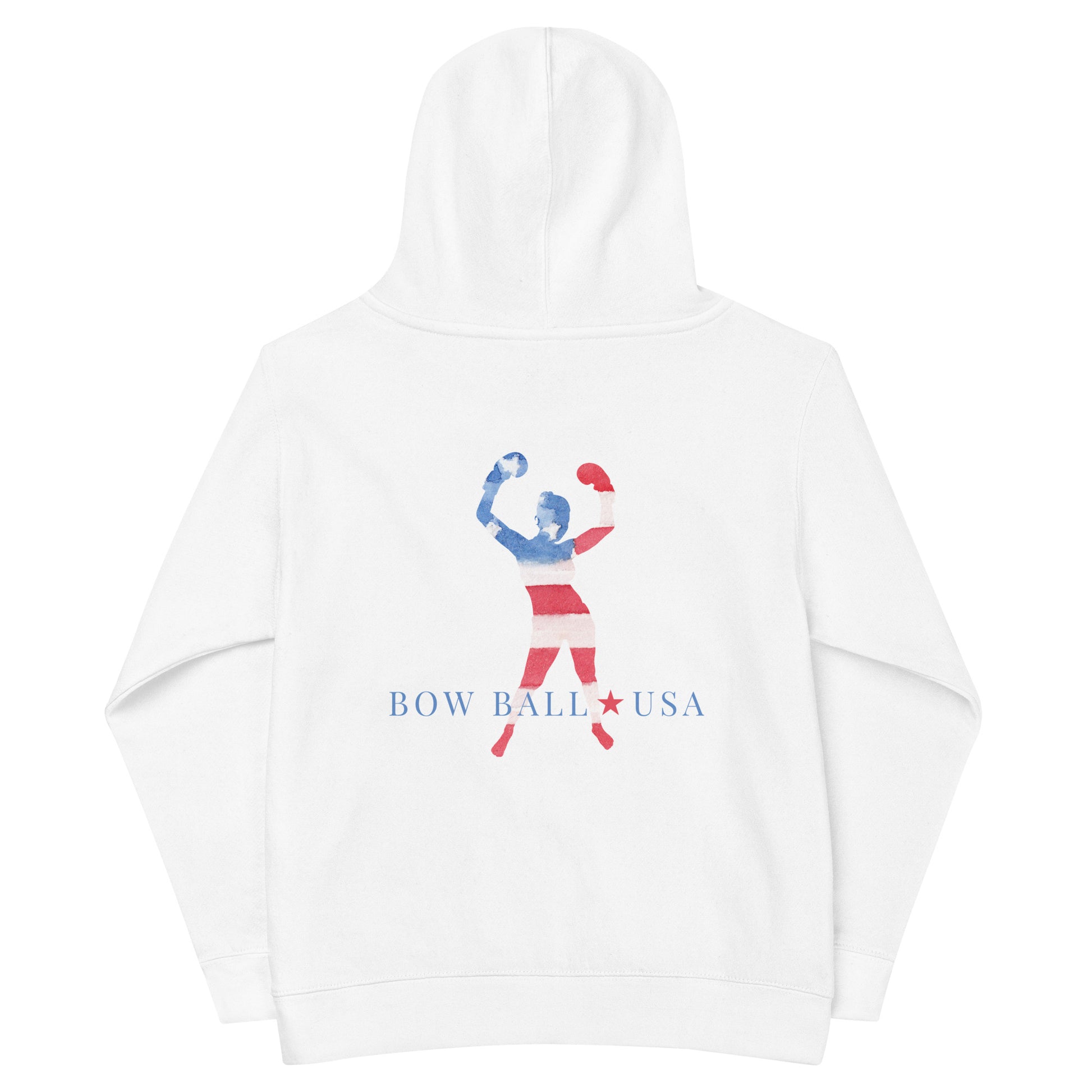 This soft and cozy fleece hoodie will become the go-to hoodie for the children in your life. The hoodie is made from durable material and has elastic cuffs and a waistband to ensure a long-lasting performance. Features All-American Boxing [Female] 🇺🇸 design on the back. May the children who wear this hoodie know they are loved. Bow Ball is cheering for them. #bowballit