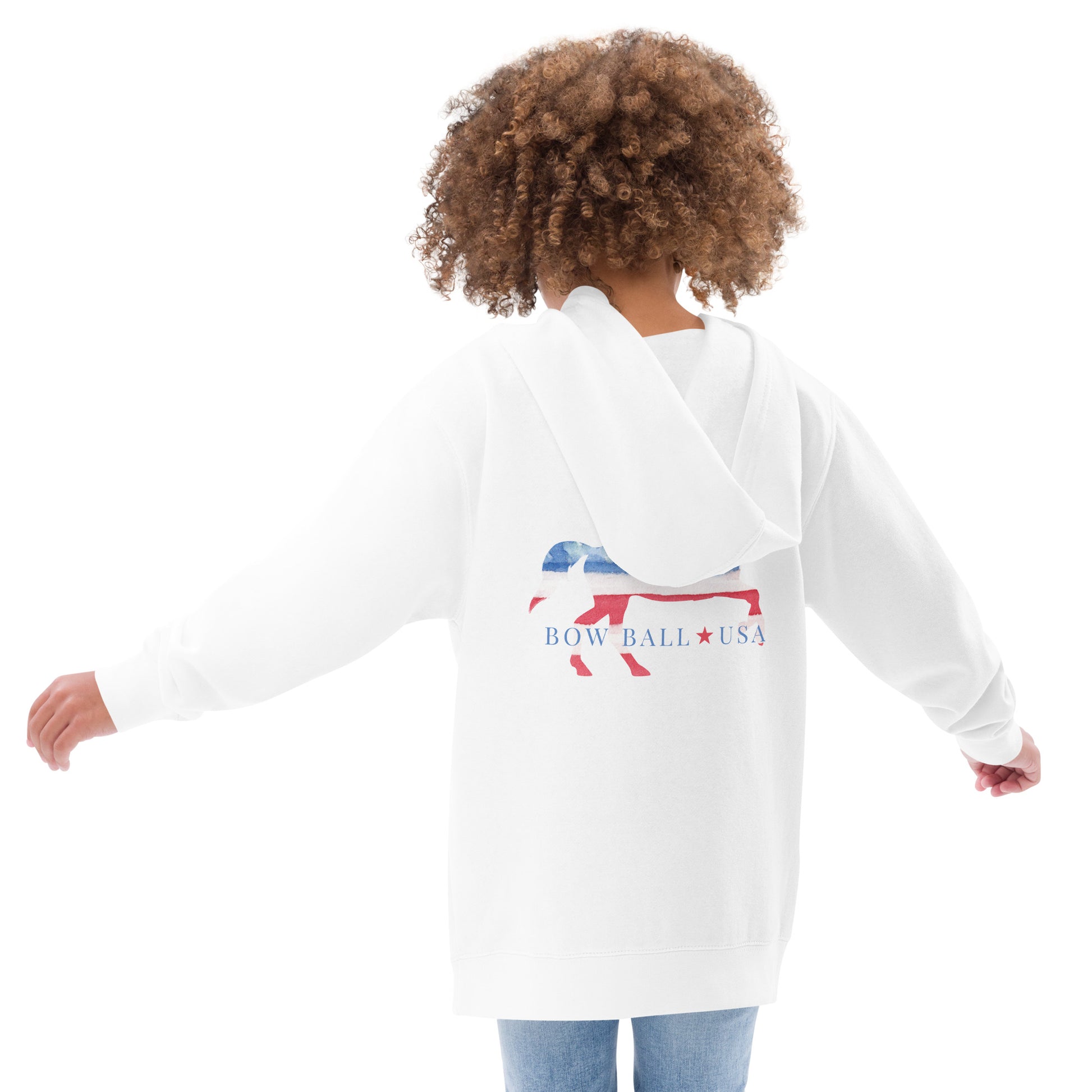 This soft and cozy fleece hoodie will become a go-to favorite for the children in your life. Made from durable material to ensure a long-lasting performance. Features All-American Horseback Riding 🇺🇸 design on the back. May the children who wear this hoodie know they are loved. Bow Ball is cheering for them. #bowballit