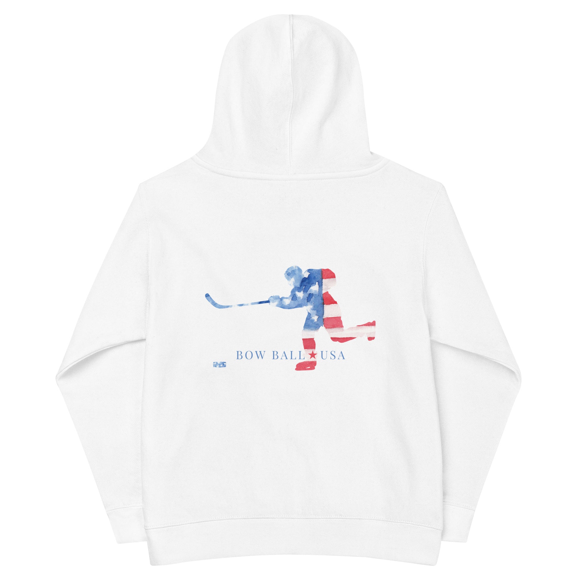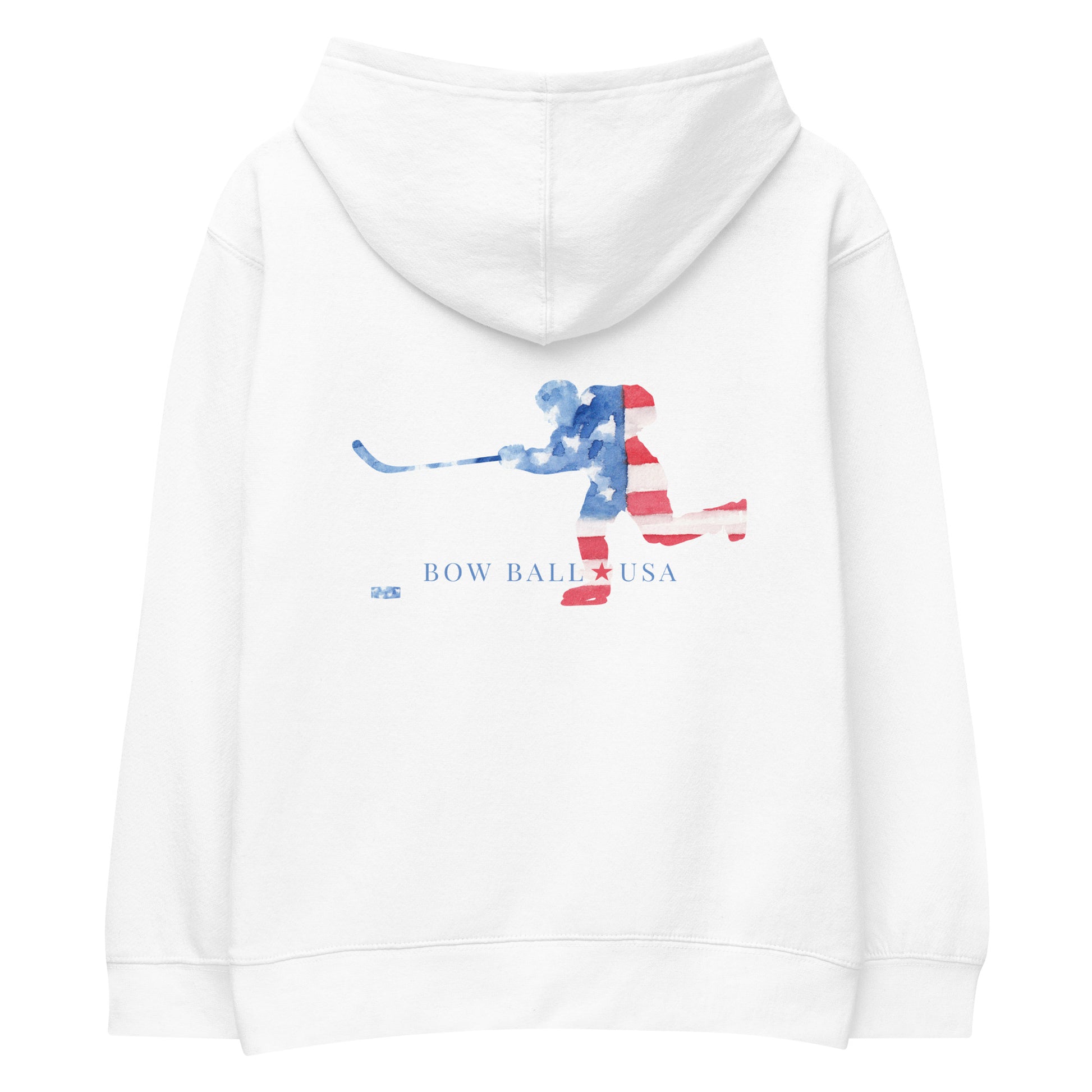 This soft and cozy fleece hoodie will become a go-to favorite for the children in your life. Made from durable material to ensure a long-lasting performance. Features All-American Ice Hockey 🇺🇸 design on the back. May the children who wear this hoodie know they are loved. Bow Ball is cheering for them. #bowballit