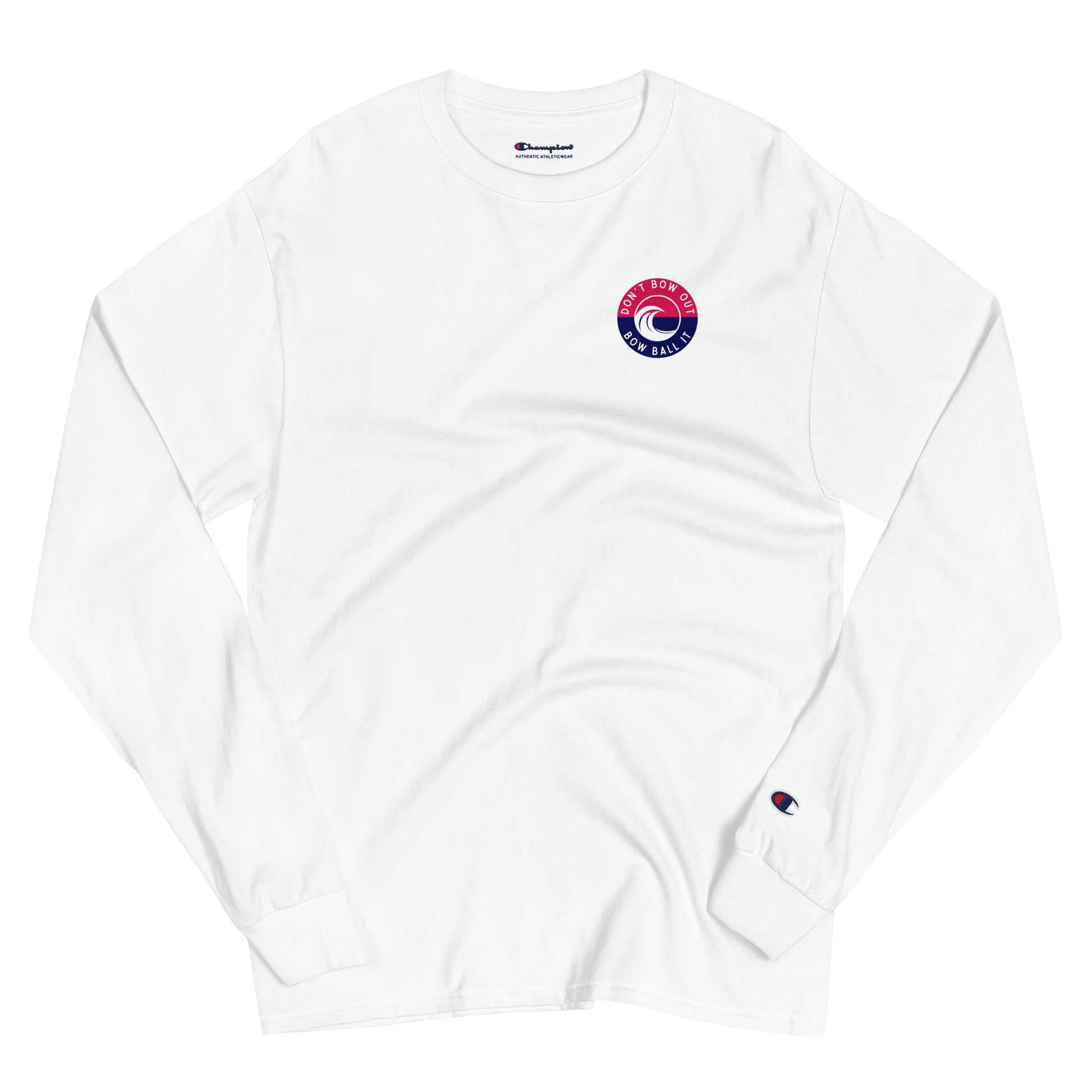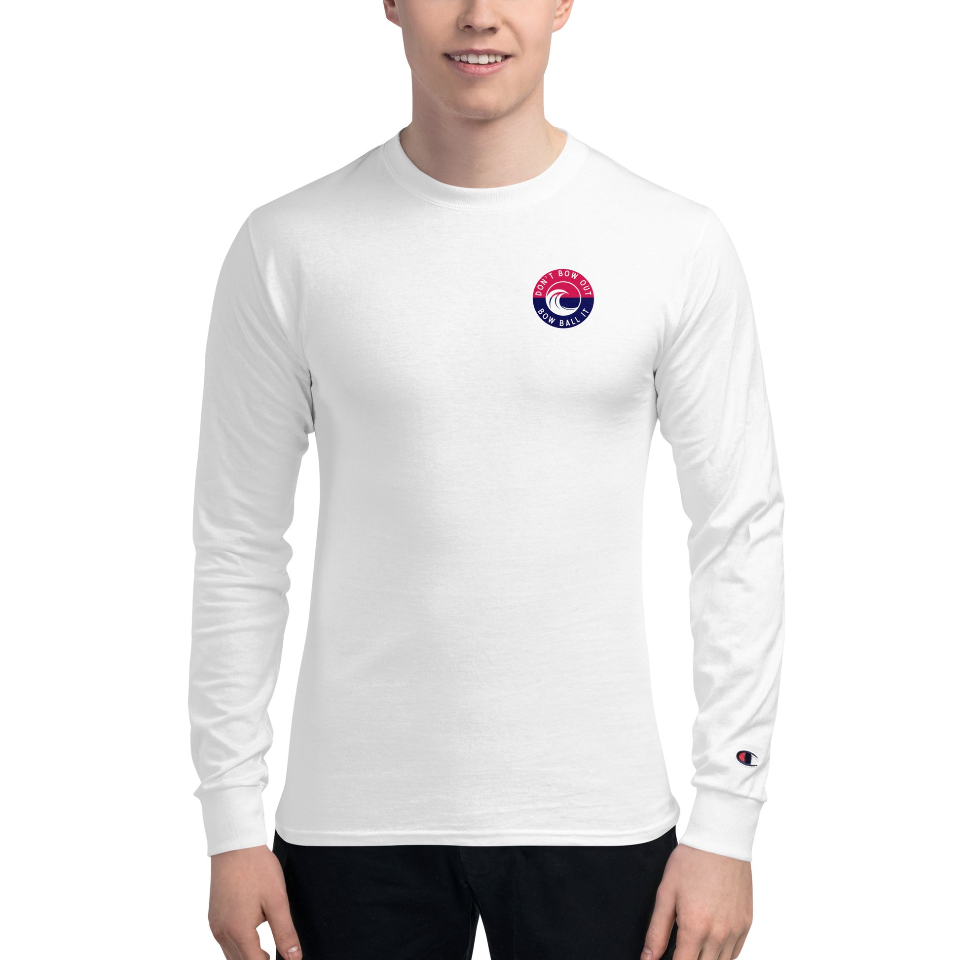 Classic men's Champion long sleeve shirt features Don't Bow Out - Bow Ball It | R, W&B design on the front and back. The soft cotton fabric and relaxed fit allows for wearing the shirt on its own, or layer it with your favorite jacket. Bonus: a Champion “C” logo is on the left sleeve. Don't Bow Out - Bow Ball It.