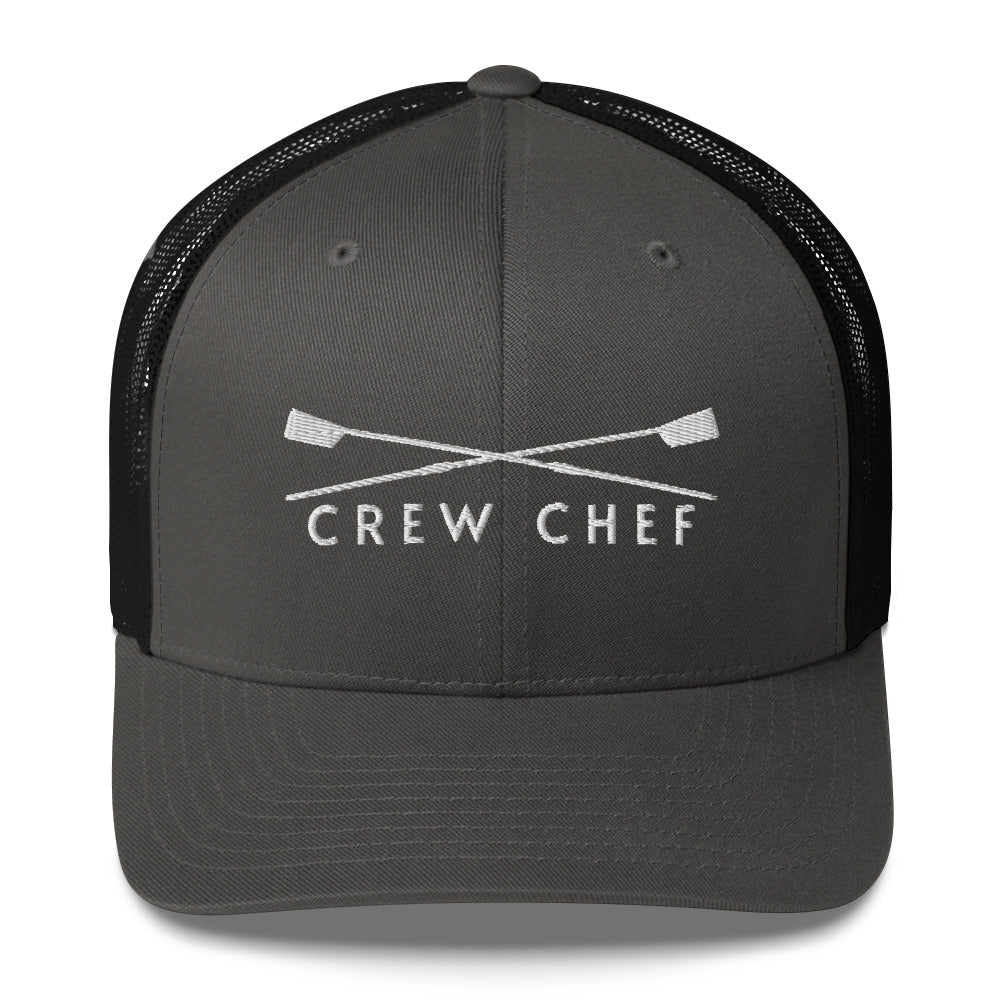 Our six-panel trucker caps with a mesh back will be a comfy and classic choice for the Crew Chefs of the rowing community. Crew Chef embroidered in white thread.